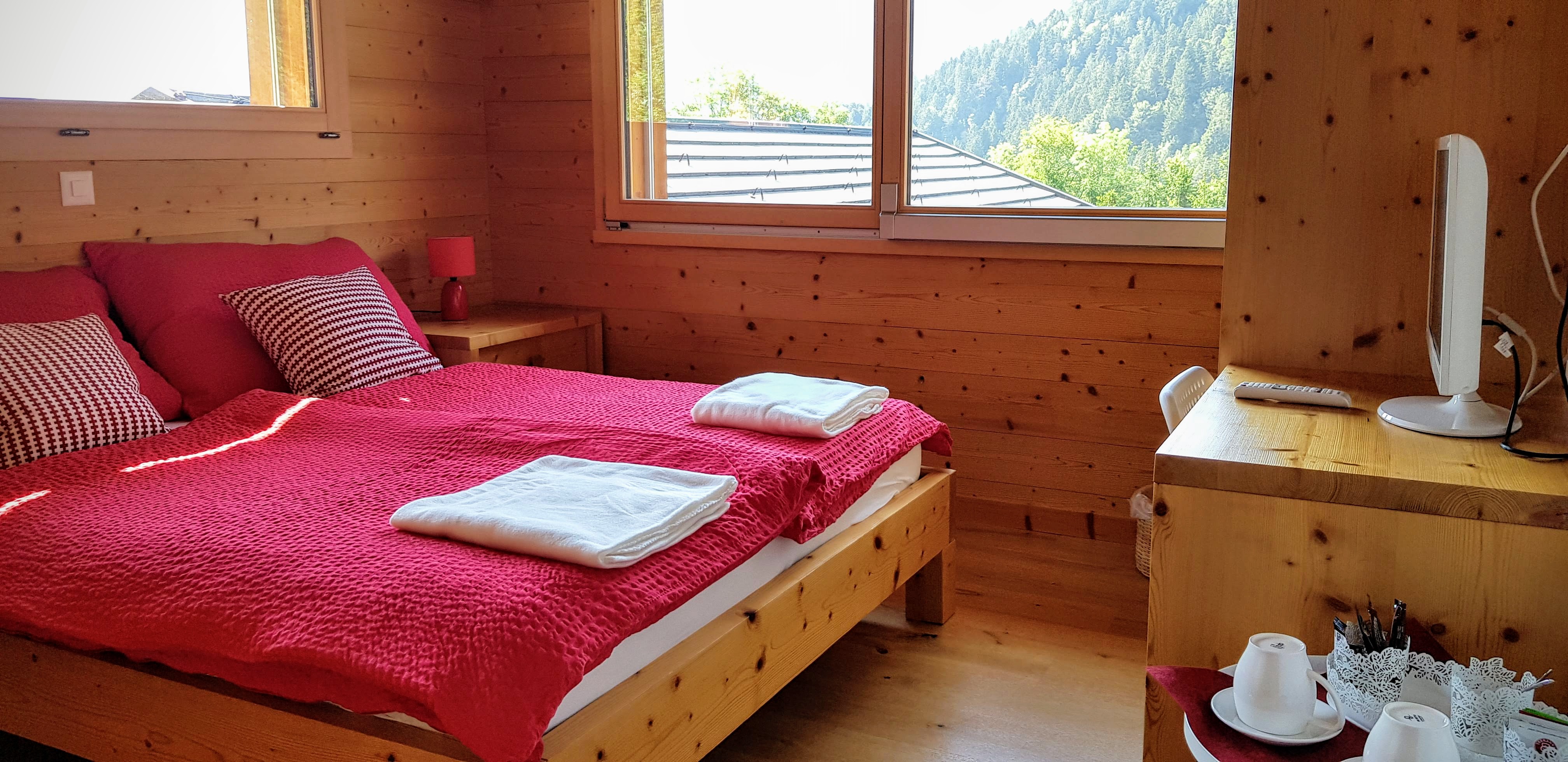Chambre famille avec salle de bains, TV, petit bureau et un balcon.